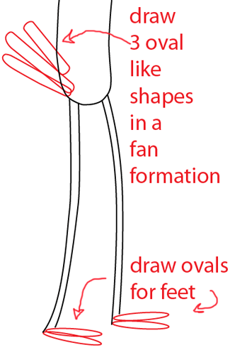 Draw three oval like shapes in a fan formation and ovals for the feet.