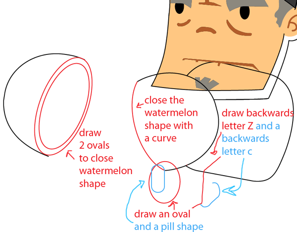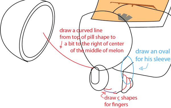 Draw a curved line from the top of the pill shape to a bit to the right of the center of the middle of the left watermelon. Draw an oval for his sleeves and ‘C’ shapes for his fingers.