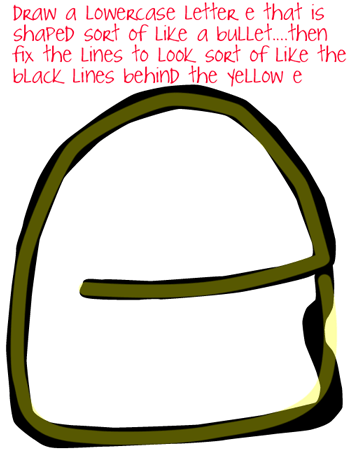 Draw a lowercase letter ‘e’ shape that is shaped to look like a bullet. Then fix the lines to look like the black lines behind the yellow ‘e’ shape.
