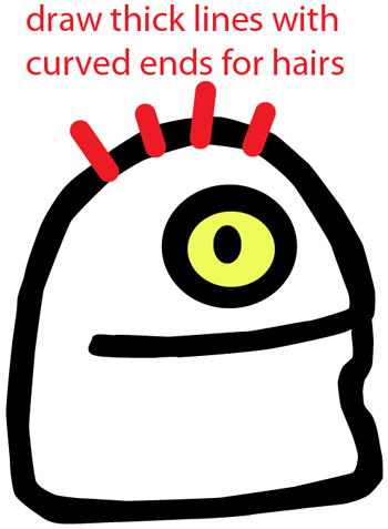 Draw thick lines with curved ends for the hair on the head.