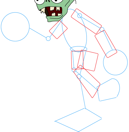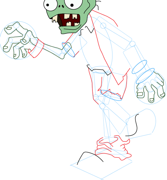 Use basic shapes that you drew in the previous steps to outline the hands. Draw some ovals for sleeves and the ripped pants legs. Draw ‘V’ shape for the waste and for the collar is a ‘Z’ or ‘2’ shape and backwards ‘Z’ or ‘2’ shape.