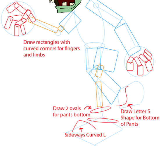 Draw rectangles with curved corners for fingers and limbs. Draw two ovals for the pants left bottom and draw the letter ‘S’ shape for the pants right bottom. Draw a sideways curved ‘L’ for the curving of the shoe.