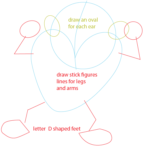 Draw an oval for each ear and a guide line in the head to help with facial placement. Draw stick figures lines for the arms and legs. Draw two ovals to draw the hands later and draw a letter ‘D’ shaped feet.