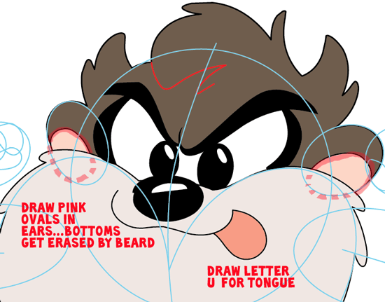 Draw pink ovals in the ear and make the bottoms be erased by the heard. Draw the letter ‘U’ shape for the tongue. Add some details on his hair.