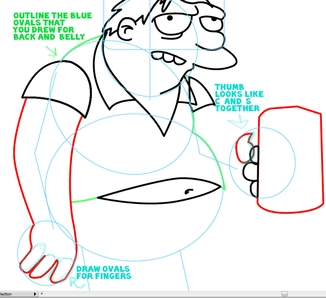 Outline the blue ovals that you drew for the back and belly. Draw the left arm and draw ovals for the fingers. Draw the right thumb that looks like a letter ‘C’ shape and a letter ‘S’ shape together. Draw the beer mug.