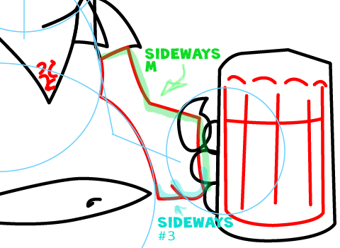 Add the detail lines to the beer mug. Draw the hair on his chest. Draw a sideways ‘M’ shape and sideways number ‘3’ shape for the right arm.