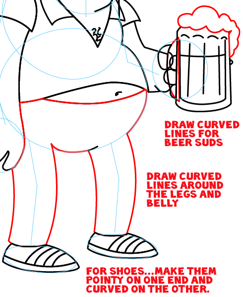 Draw curved lines for beer suds. Draw curved lines around the legs and belly. For the shoes, make them pointy on one end and curved on the other end.