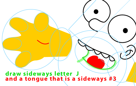 Draw a sideways letter ‘J’ shape for the outline of the mouth and a tongue that is a sideways number ‘3’ shape. Draw a curve for a crease in Bart’s hand.