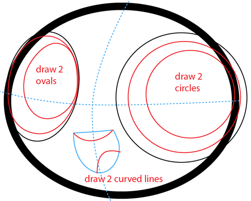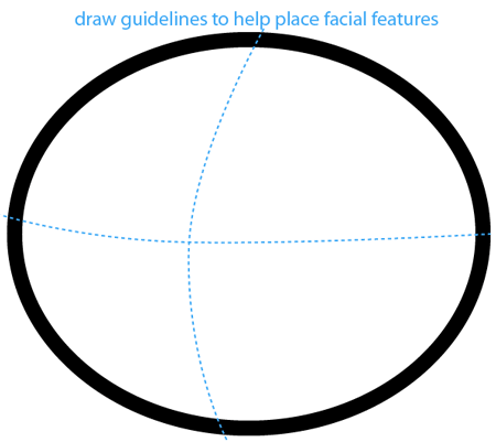 Draw an oval with a think line then draw guidelines to help place the facial features.