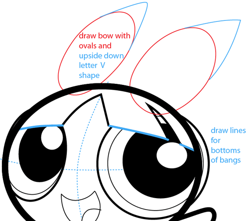 Draw Β the bow with ovals and an upside down letter ‘V’ shape. Draw lines for the bottom of the bangs.