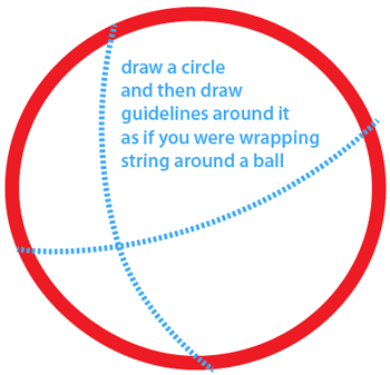 Draw a circle and then draw the guidelines around it as if your were wrapping a string around a ball.