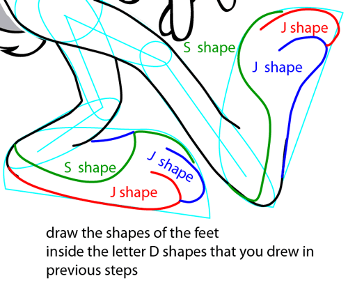 Draw the shapes of the feet inside the letter ‘D’ shapes that you drew in previous steps. Draw a letter ‘S’ shape and two letter ‘J’ shapes in each foot.