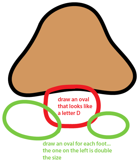 Draw an oval that looks like a letter ‘D’ shape and draw an oval for each foot, making the one on the left a double size.