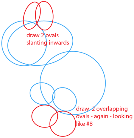 Draw two ovals slanting inwards for the eyes. And then two more overlapping ovals that also looks like a number ‘8’ shape.