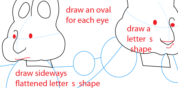 Draw an oval for each eye. Draw a sideways flattened letter ‘S’ shape for the Max’s mouth and draw a letter ‘S’ shape for the Ruby’s upper lip.