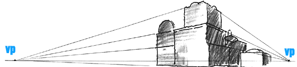More specifically, when we are drawing or viewing something in 2 point perspective, we are seeing the object at a corner, and the 2 sets of parallel lines are moving away from us to the vanishing points….as you see above (vp stands for vanishing points).