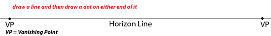 We will be drawing in 2 point perspective which means that we will be using two vanishing points in order to make a more 3 dimensional object. Draw a line and then draw a dot on either end of it (those dots are the vanishing points).
