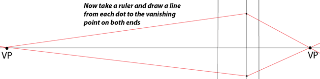 Now take a ruler and draw a line from each dot to the vanishing point on both ends.
