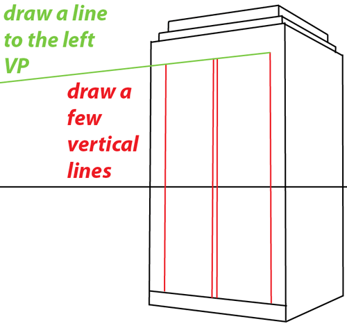 Draw a few small vertical lines as you see in the illustration above. Draw the lines to both vanishing points from black dots. Notice that the lines that we didn’t need were erased from the last step.