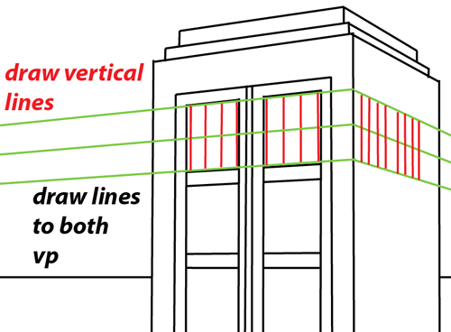 Draw four vertical lines and draw lines to the left vanishing point for the windows and panels of the door.