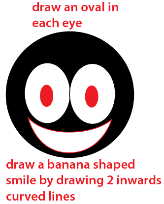 Draw an oval in each eye for the pupils. Then draw a banana shaped smile by drawing two inwards curved lines.