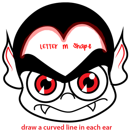 Draw a curved line in each ear and a letter ‘m’ shape for his hair line.