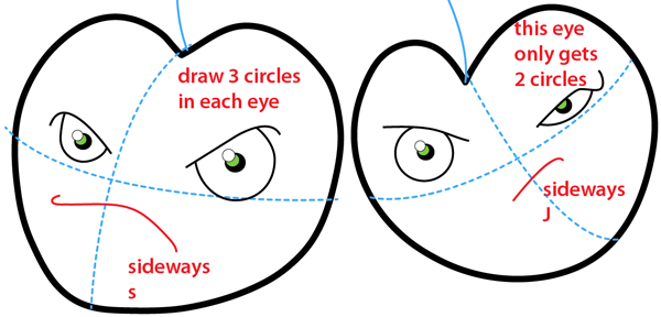 For their smiles, draw a sideways ‘s’ shape (left cherry) and a sideways ‘J’ shape (right cherry). Then draw three circles in each eye except for the second cherry’s right eye which only need two circles.