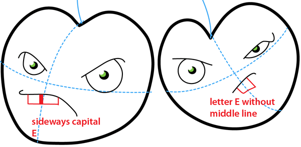 For their teeth, draw a sideways capital ‘E’ shape for the left cherry and a letter ‘E’ shape without the middle line for the right cherry.