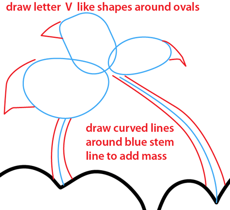 Then draw letter ‘V’ like shapes around the ovals and draw curved lines around the blue stem line to add mass.