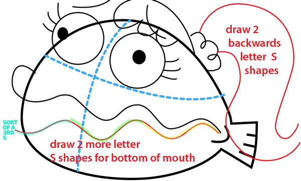 Draw two backwards letter ‘S’ shapes for her hair and two more letter ‘S’ shapes for the bottom of her mouth.