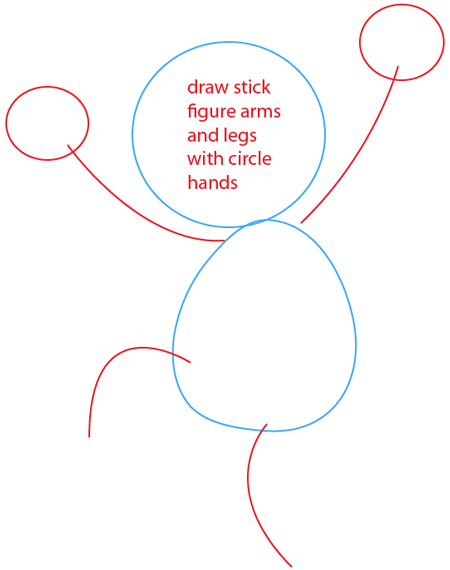 Then draw stick arms and legs with circle hands.