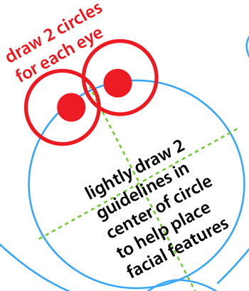Lightly draw two guidelines in the center of the circle to place facial features. Then draw two circles for each eye as shown in the illustration above.