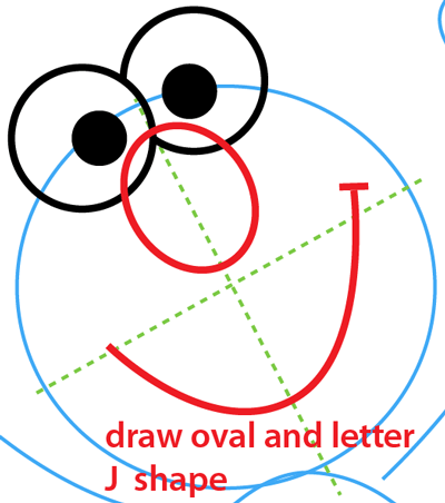 Draw an oval for his nose and a letter ‘J’ shape for his smile.