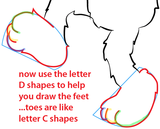 Now use the letter ‘D’ shapes to help you draw the feet. The toes are like letter ‘C’ shapes.