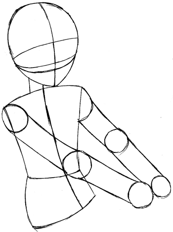 Draw Momiji’s arms next. Draw straight cylinders that narrow slightly as they reach the hands.