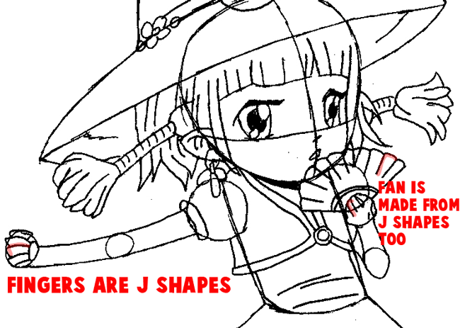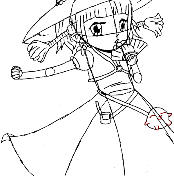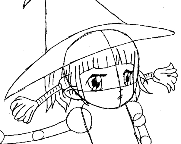 For her hat, draw the outline by drawing a large triangle shape sitting on top of a flattened crescent shape.