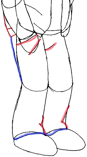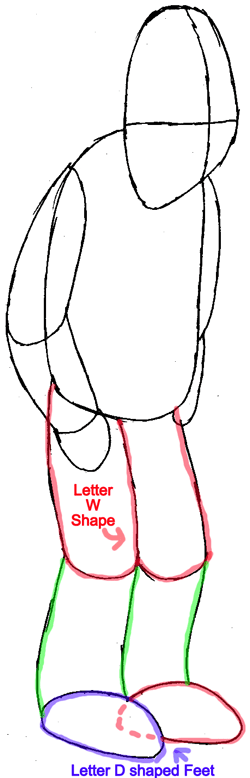 For the feet, draw cylinders that become baggy as they go to the feet.