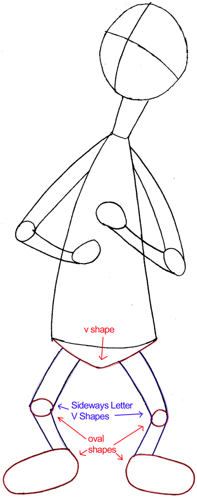 Use simple shapes to draw his legs.