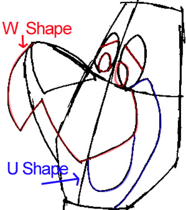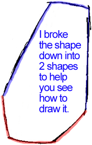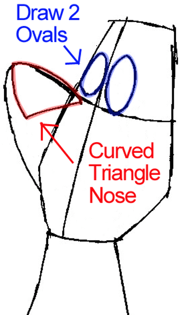 First, you need to draw his head. I broke the shape down into 2 shapes to help you see how to draw it. The first shape is a shield like shape, while the second one is a sideways letter ‘J’ shape ( his nose). Draw a guideline through the center of the shield looking shape.