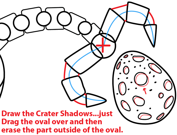 Next, draw the crater shadows, just drag the oval over then erase the part outside of the oval.