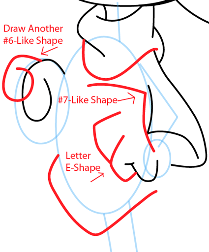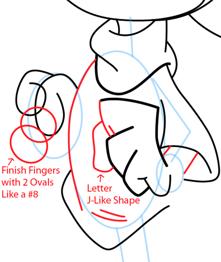 Continue drawing shapes for his hand and shirt.