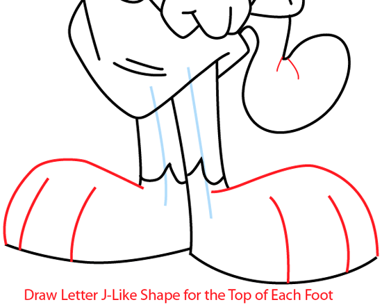 Draw the details to his tail. Draw two curved lines for the top of his feet and 4 curved lines for his toes. Finally clean up your drawing by erasing the extra lines.