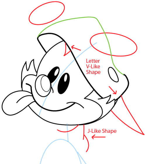 Draw two ovals on the top of the cap (these will be the top of his ears). Then draw two letter ‘V’ shapes, one for his hairline and one for the back of his cap. Draw a letter ‘J’ like shape for his collar and neck.