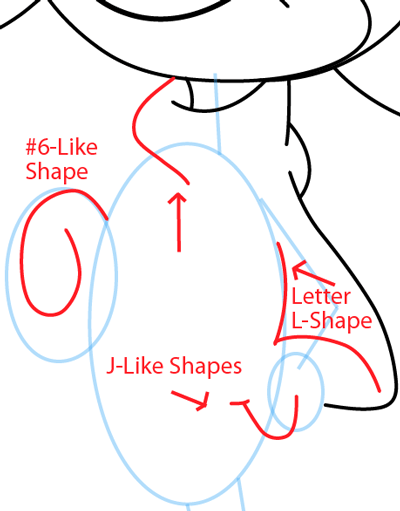 Begin his tail and feet by drawing a letter ‘S’ like shape for the tail and 2 slightly curved lines for his legs.