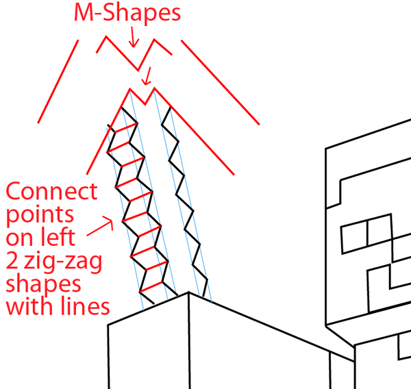 Draw ‘M’ shapes and connect points on the left, 2 zig-zag shapes with lines (like the illustration above).
