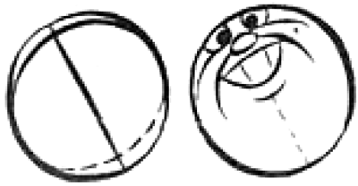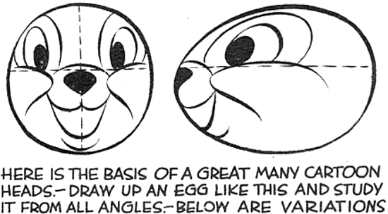 Here is the basis of a great many cartoon heads. Draw up an egg like this and study it from all angles. Below are some variations.
