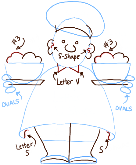 Today we will show you how to draw an adorable cartoon chef, serving up two hot bowls of something yummy! A chef is someone who is trained to cook wonderful meals…and he usually is the person making your meals when you go to a restaurant. Find out how to draw a cute cartoon chef with simple geometric shapes, as well as the simple shapes of numbers and letters.