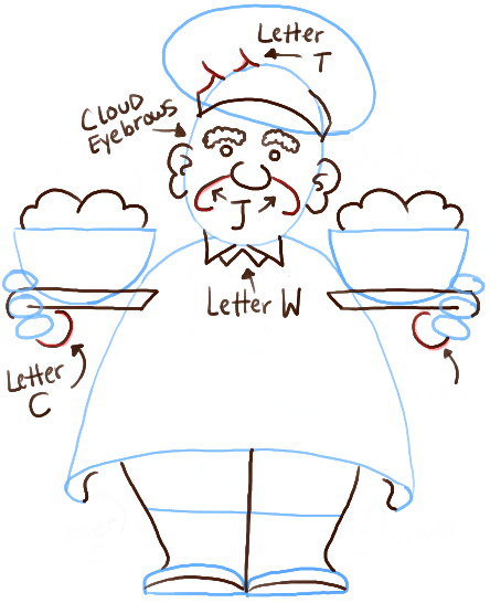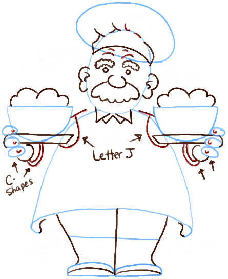 – Draw a capital letter ‘D’ shape on both sides of the chef.