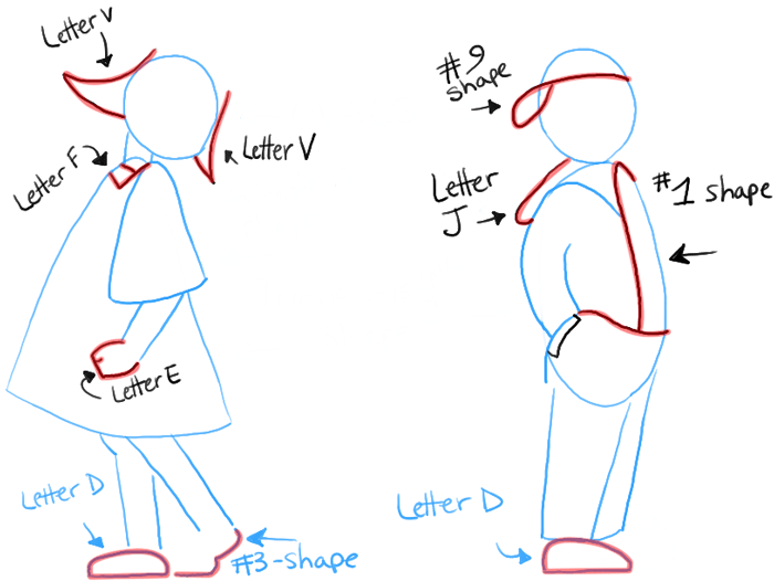– Draw a #3-like shape on one of the girl’s shoes and one of the boy’s shoes.