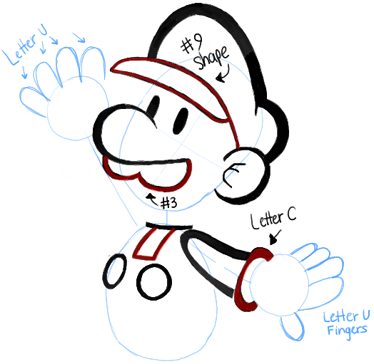 Lightly draw the basic guidelines that make up Luigi’s body. Lightly draw an oval for the body and face. Draw guidelines within the face to help place the facial features later. Draw circles for hands. Connect them with lines.